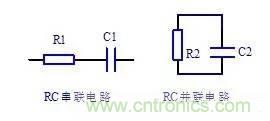 電路中電阻與電容組合在一起的電路稱(chēng)為RC電路,圖中R1和C1構(gòu)成了RC串聯(lián)電路,R2和C2構(gòu)成了RC并聯(lián)電路。