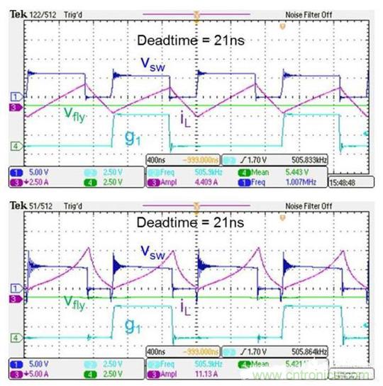 同理對于Q2開啟時,如果電感電流為正,那么當(dāng)我們首先關(guān)閉Q1管時,Vsw就會被電感電流拉低到0,因為iL》0, Q2的Coss會discharged到0,然后我們再開啟Q2,就可以達(dá)到ZVS了。這里我有一張其他Topology的PWM converter的波形圖,也和buck工作原理類似,大概可以看看基本原理,也就是電感電流為負(fù)時,Q1可以實現(xiàn)ZVS,讓Vsw的ringing比較小。而當(dāng)電感電流為正時,實現(xiàn)不了ZVS,Vsw的ringing就比較大了。