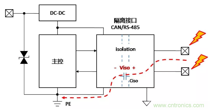 當(dāng)總線側(cè)接口受到靜電放電時,靜電能量通過隔離接口模塊內(nèi)部總線側(cè)器件泄放至PE,但若ESD能量超出了接口模塊內(nèi)部總線側(cè)器件的ESD抗擾能力,總線接口則可能損壞,如下面圖5。