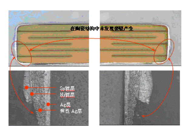 柔性端頭SuperTerm系列產(chǎn)品在板彎測(cè)試中產(chǎn)生破壞時(shí),其破壞模式是開(kāi)路模式,而。一般端電極開(kāi)路或短路模式都會(huì)產(chǎn)生 。柔性端頭SuperTerm系列中的彈性層可從剖面圖中看見(jiàn),其成份中含有〝高分子銀〞以產(chǎn)生此彈性效果。