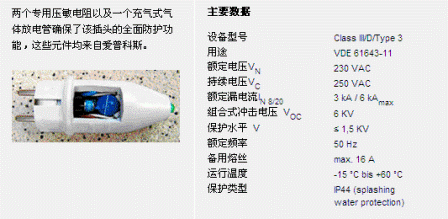 兩個專用壓敏電阻以及一個充氣式氣體放電管確保了該插頭的全面防護功能,這些元件均來自愛普科斯。