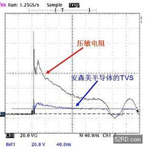 圖3:TVS元件與壓敏電阻在8kVIEC61000-4-2應(yīng)力沖擊測試下的輸出波形對比
