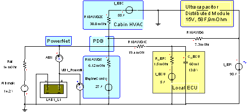 上圖與前一張PowerNet電路圖相同,但是,增加了放置在EPS負(fù)載點(diǎn)的超級(jí)分布式模塊。這個(gè)超級(jí)模塊是一個(gè)標(biāo)準(zhǔn)的汽車設(shè)計(jì)產(chǎn)品,它在大的用電負(fù)載附近像電池一樣提供穩(wěn)定和平滑的PowerNet。所有其它地方一樣,存在超級(jí)分布式模塊的地方,就可以容易地在PowerNet和ECU電壓上觀察到平滑作用。