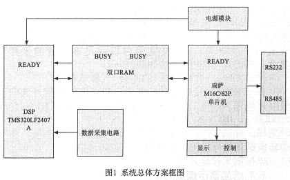 硬件平臺(tái)是軟件算法的運(yùn)行載體,是實(shí)現(xiàn)準(zhǔn)確、高效選線(xiàn)的保障。本文設(shè)計(jì)的選線(xiàn)裝置采用雙CPU。即"DSP+單片機(jī)"的處理機(jī)構(gòu)。DSP作為運(yùn)算CPU,負(fù)責(zé)信號(hào)采集、選線(xiàn)計(jì)算部分;單片機(jī)作為管理CPU,主要負(fù)責(zé)人機(jī)交互部分。DSP處理器由于內(nèi)部采用哈佛總線(xiàn)結(jié)構(gòu),指令是流水線(xiàn)操作,以及獨(dú)立的硬件乘法器結(jié)構(gòu)等,非常適合進(jìn)行數(shù)字信號(hào)處理,進(jìn)行實(shí)時(shí)的數(shù)據(jù)分析和監(jiān)控。本文采用TI公司的TMS320LF2407A(以下簡(jiǎn)稱(chēng)LF2407A)DSP芯片為數(shù)據(jù)采集和處理CPU,充分利用其強(qiáng)大的數(shù)據(jù)處理能力和速度,實(shí)現(xiàn)多點(diǎn)數(shù)據(jù)采集和快速參數(shù)計(jì)算。單片機(jī)采用瑞薩M16C/62P系列單片機(jī),該單片機(jī)具有很強(qiáng)的抗干擾能力和1M的尋址空間,適用于事件管理和人機(jī)交互。系統(tǒng)總體方案如圖1所示。本保護(hù)裝置位于現(xiàn)場(chǎng),進(jìn)行數(shù)據(jù)采集和處理,并且與上位機(jī)之間進(jìn)行通信。保護(hù)裝置采用M16C/62P單片機(jī)為主CPU,負(fù)責(zé)系統(tǒng)顯示、控制和與上位機(jī)通信;采用TMS320LF2407ADSP為從CPU,負(fù)責(zé)數(shù)據(jù)采集和處理;DSP與單片機(jī)之間用雙端口RAM進(jìn)行通信。系統(tǒng)通過(guò)RS232和RS485與上位機(jī)通信。