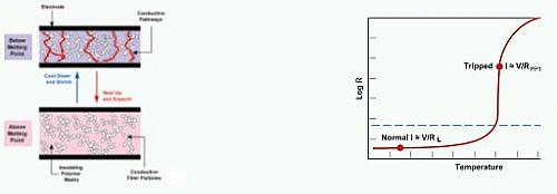 圖2.在過電流或過熱情況下,PPTC元件通過從低阻值狀態(tài)轉(zhuǎn)換為高阻值狀態(tài)來保護(hù)電路