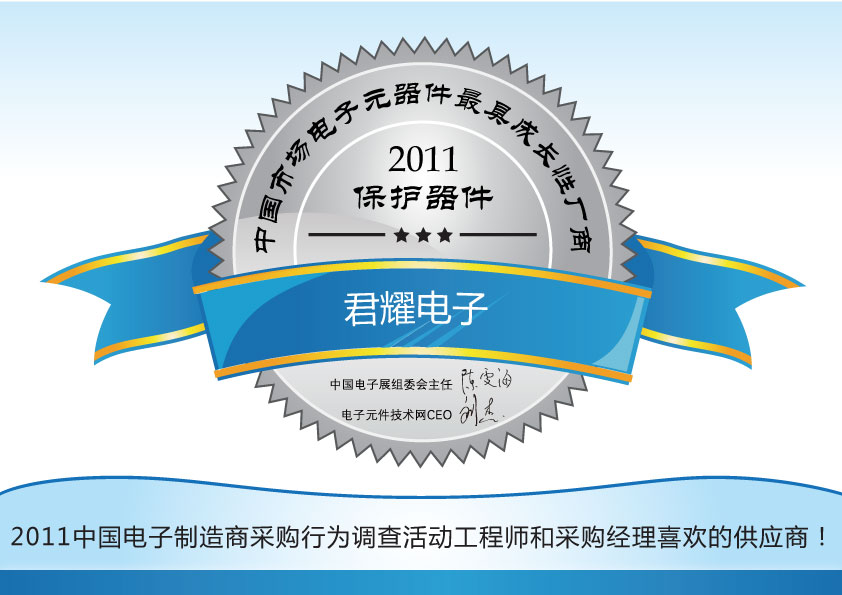 在近日剛剛結(jié)束的2011中國電子制造商采購行為調(diào)查暨中國市場電子元器件領(lǐng)軍廠商的評選活動中,君耀電子憑借本地化和快速的服務(wù)、可靠穩(wěn)定的產(chǎn)品質(zhì)量和技術(shù)指標等多方面優(yōu)勢,以及在工程師心目中形成的良好形象,一舉榮獲2011中國市場電子元器件保護器件類最具成長性廠商稱號!