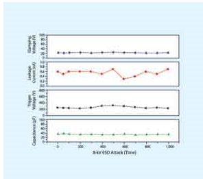 基于硅的瞬態(tài)電壓抑制器件工作在標準P/N結的擊穿狀態(tài),相比基于聚合物-間隙(polymer- gapbased)的器件可提供相對低的觸發(fā)電壓和鉗位電壓。該類器件的泄漏電流比空氣間隙器件(air-gap device)的高10~20倍,其相對較高的固有電容導致高信號失真和插入損耗?;诳諝忾g隙的器件在以上討論過的所有技術中可提供最低的電容和鉗位電壓,其工作在兩個電極間的惰性氣體擊穿狀態(tài)?;诳諝忾g隙的器件可以防止高達15kV的脈沖,它們在經(jīng)歷1000次脈沖沖擊后性能特點也相當穩(wěn)定(如圖2 所示)。基于空氣間隙的器件泄漏電流略高于基于聚合物-間隙的器件,但是其電容和插入損耗與聚合物器件相當或者稍好一些,并且其鉗位電壓和觸發(fā)電壓要低得多。