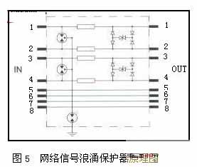 BAx系列信號浪涌保護器是專為通過雙絞線進行信號傳輸?shù)脑O(shè)備而設(shè)計,以保護其避免遭受感應(yīng)過電壓和操作過電壓的損害。該浪涌保護器輸入、輸出采用RJ45公/母于接頭串聯(lián)保護。網(wǎng)絡(luò)信號浪涌保護器原理圖見圖5所示。