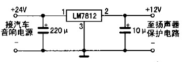 具體制作如下:先把功放輸出端與音箱的引線切斷,按圖2所示電路將引線頭a、b分別接功放的兩組輸出端,c、d分別接左、右聲道音箱:揚(yáng)聲器保護(hù)電路的電源只能從收放機(jī)中獲取,不可直接從汽車(chē)12 v電源中獲取,否則不起開(kāi)/關(guān)機(jī)保護(hù)作用;若是柴油車(chē)所配置的收放機(jī)(使用24 V電源),則要求增加一個(gè)降壓電路(見(jiàn)圖3所示),給揚(yáng)聲器保護(hù)電路供電,以免電源電壓過(guò)高損壞IC。