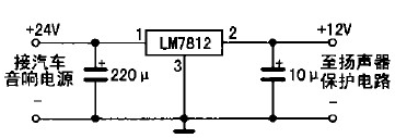 具體制作如下:先把功放輸出端與音箱的引線(xiàn)切斷,按圖2所示電路將引線(xiàn)頭a、b分別接功放的兩組輸出端,c、d分別接左、右聲道音箱:揚(yáng)聲器保護(hù)電路的電源只能從收放機(jī)中獲取,不可直接從汽車(chē)12 v電源中獲取,否則不起開(kāi)/關(guān)機(jī)保護(hù)作用;若是柴油車(chē)所配置的收放機(jī)(使用24 V電源),則要求增加一個(gè)降壓電路(見(jiàn)圖3所示),給揚(yáng)聲器保護(hù)電路供電,以免電源電壓過(guò)高損壞IC。