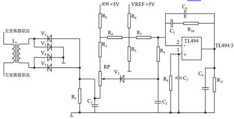 本開關(guān)電源過(guò)流保護(hù)電路的工作原理見圖4。變壓器T 1原邊串接在開關(guān)電源主變壓器原邊回路中, 通過(guò)實(shí)驗(yàn)選擇合理的變壓器原副邊匝數(shù)比,感應(yīng)開關(guān)電源變換時(shí)的原邊電流值, 經(jīng)二極管V1 ~ V4 整流, R1、C1 濾波后送電位器RP。原邊電流越大,電流取樣變壓器整流出的電壓越大, 電位器RP 中心點(diǎn)電壓越低,TL494: 2 腳電壓隨之下降, 使得TL494: 3 腳電壓升高,送入脈寬調(diào)制器, 將T L494 驅(qū)動(dòng)脈沖寬度逐漸減少, 從而得到過(guò)流保護(hù)的目的。圖中電容C4、C5、R10為TL494 誤差放大器的反饋元件, 使得放大電路穩(wěn)定可靠。