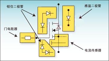 突出顯示的元件組成一個特性板,可以將其中的功能集成到MOSFET中。這些元件從右上角開始按順時針方向為:溫度感應二極管、電流傳感器、鉗位二極管(內(nèi)部二極管,未顯示)和門電阻器。通過加入鉗位二極管和門電阻器眾所周知的保護特性,可以保護對電壓敏感的柵氧化層免受危險電場的破壞。
