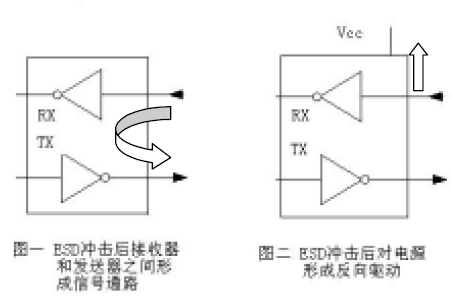 某些RS-232 接口電路中的ESD 保護(hù)結(jié)構(gòu)經(jīng)過(guò)ESD 沖擊后可能在輸入端與供電電源Vcc之間形成電流通路圖二對(duì)其供電電源產(chǎn)生反向驅(qū)動(dòng)如果供電電源沒(méi)有吸入電流的能力通常來(lái)講電源輸出回路里有一個(gè)正向二極管這將導(dǎo)致電源電壓Vcc 的增加從而損