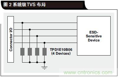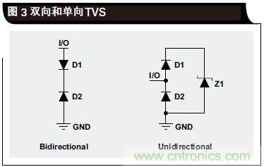 立即沿這條通路接地。在單向 TVS 情況下,只要 D2 和Z1 都不進入其擊穿區(qū)域,則電壓信號會在接地電壓以上擺動。當正ESD電擊擊中I/O線路時,D1變?yōu)檎蚱?,而Z1 先于 D2 進入其擊穿區(qū)域;通過 D1 和 Z1 形成一條接地通路,從而讓 ESD 能量得到耗散。當發(fā)生負ESD 事件時,D2 變?yōu)檎蚱?,ESD能量通過 D2接地通路得到耗散。由于 D1 和 D2 尺寸可以更小、寄生電容更少,單向二極管可用于許多高速應用;D1 和 D2 可以“隱藏”更大的齊納二極管 Z1(大尺寸的原因是處理擊穿區(qū)域更多的電流)。