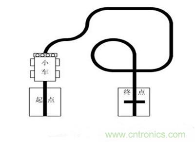 所謂小車循跡,就是在白紙上畫出黑色的線條,稱為賽道;小車沿著賽道按要求(可以做一些指定的任務(wù))行進(jìn)時,能自動識別賽道并按賽道線條行走,稱為小車循跡。如圖1所示,該賽道是2010年全國職業(yè)院校大學(xué)生職業(yè)技能競賽月球車競賽項(xiàng)目湖南賽區(qū)賽道圖。