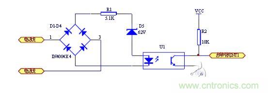 當(dāng)沒有振鈴信號時,線路上的供電電壓為48V(部分交換機為60V),經(jīng)四個二極管構(gòu)成的全橋整流后,不足以使62V穩(wěn)壓管導(dǎo)通,振鈴信號輸出端電壓接近0V,當(dāng)振鈴信號到來時,線路上的90V交流振鈴信號經(jīng)全橋整流變換后90V的脈動直流電,其峰值足以擊穿耐壓值為62V穩(wěn)壓管,經(jīng)電阻R1給U1提供電壓,從光電耦合器輸出的波形是 時通時斷的方波方波信號,可以直接輸出至單片機的中斷輸入口, CPU可以根據(jù)振鈴信號光電轉(zhuǎn)換后的高低電平檢測有無振鈴。