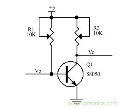 2、當我們調(diào)節(jié)可調(diào)電阻,R1,使R1=4.3K時,通過歐姆定律我們可以計算得到,Ib=(5-0.7)/4.3K=1mA,那我們就可以計算出IC=Hfe*Ib=10mA,假如這個時候我調(diào)節(jié)R3,使R3=1K歐姆,通過計算我們可以得到Vc=5-(10mA*1K)=-5V,回出現(xiàn)-5V嗎,當然不會,因為沒有負壓,所以Vc的電壓會停留在0V,那這個時候我們再來看下Ic到底是多少?