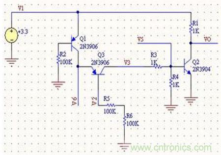 若Q1和Q3基極同時為低時,Q2導(dǎo)通而使得VO為0造成晶振停振關(guān)閉處理器。我們分析R3和R4(實際電路470K)使得Q2和Q3處于飽和態(tài);Q3為Q1集電極負(fù)載,調(diào)整R5阻值時可控制Q1處于飽和態(tài)或放大態(tài)。要使Q2基極導(dǎo)通必須使Q1提供足夠大電流才滿足條件,只有Q1處于放大態(tài)才滿足條件;