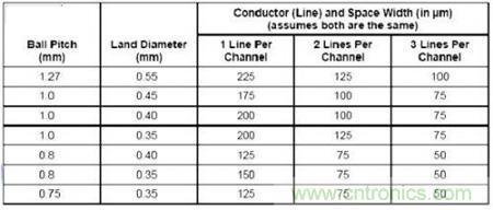 一旦完成了Dog bone型扇出,并且確定了特定的過(guò)孔焊盤(pán)尺寸,第二步就是定義從BGA進(jìn)入電路板內(nèi)層的走線(xiàn)寬度。確認(rèn)走線(xiàn)寬度時(shí)要考慮許多因素。表1顯示了走線(xiàn)寬度。走線(xiàn)之間要求的最小空間限定了BGA迂回布線(xiàn)空間。重要的是要知道,減小走線(xiàn)之間的空間將增加電路板制造成本。