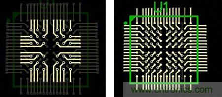 圖6所示的扇出方法避免了使用高端技術(shù),而且不影響信號(hào)完整性。BGA引腳被分成內(nèi)部和外部引腳兩個(gè)部分。焊盤(pán)內(nèi)過(guò)孔用于內(nèi)部,外部引腳在0.5mm柵格上扇出。圖7a顯示的是頂層,圖7b顯示的是頂層和內(nèi)部布線(xiàn)層。