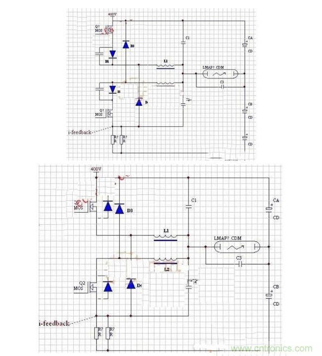 再講時序,當(dāng)換相,如:Q1停,輪到Q2工作的瞬間,當(dāng)Q2開,此時L2上的壓降是200V(VA)+VL,慢慢過渡到200V(VA)-VL。這個瞬間給C2放電的電流并不經(jīng)過電流采樣電阻,隨電功率大,C2容量也大,小功率時可以靠Q2硬撐,大功率時,幾十安的沖擊電流如何能撐?在這種拓?fù)淅?,為了兼顧電流采樣的有效性C3遠(yuǎn)遠(yuǎn)小于C1C2。