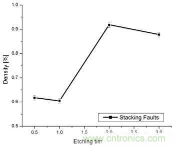 圖1.層錯(cuò)密度是蝕刻時(shí)間的函數(shù),隨蝕刻時(shí)間增加而上升。