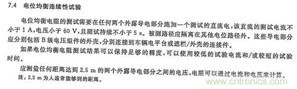 ③ISO 6469-3 Electrically propelled road vehicles-Safety specification-Part3:Protection of persons against electric shock GB/T 18384-3對等電位連接的設(shè)計要求、測試要求在標準6.3.1和6.9中做了明確規(guī)定。