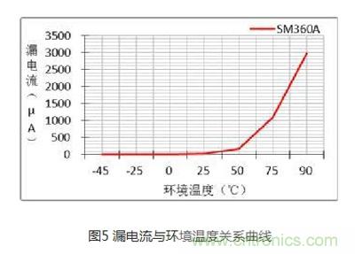 在我們開發(fā)產(chǎn)品的過程中,高低溫環(huán)境對電子元器件的影響才是產(chǎn)品穩(wěn)定工作的最大障礙。環(huán)境溫度對絕大部分電子元器件的影響無疑是巨大的,二極管當(dāng)然也不例外,在高低溫環(huán)境下通過對SM360A的實測數(shù)據(jù)表1與圖3的關(guān)系曲線可知道:二極管的導(dǎo)通壓降與環(huán)境溫度成反比。在環(huán)境溫度為-45℃時雖導(dǎo)通壓降最大,卻不影響二極管的穩(wěn)定性,但在環(huán)境溫度為75℃時,外殼溫度卻已超過了數(shù)據(jù)手冊給出的125℃,則該二極管在75℃時就必須降額使用。這也是為什么