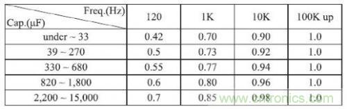 注:紋波電流還有一個(gè)溫度系數(shù),例如105℃電容,在85℃環(huán)境溫度下,允許的最大紋波電流約為額定最大紋波電流的1.73倍,該參數(shù)一般不在電容手冊(cè)中體現(xiàn)。