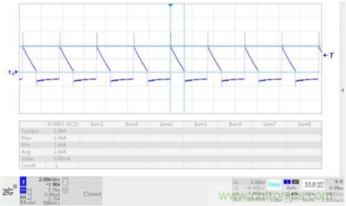測(cè)試電解電容紋波電流時(shí),需將電容引腳穿入電流探頭中,通過示波器可讀得交流有效值。本設(shè)計(jì)實(shí)例的紋波電流測(cè)試結(jié)果如圖3所示,示波器讀得有效紋波電流為1.64A,與理論設(shè)計(jì)接近。因此理論計(jì)算具有較大的工程指導(dǎo)意義。