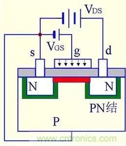 在一塊濃度較低的P型硅上擴散兩個濃度較高的N型區(qū)作為漏極和源極,半導(dǎo)體表面覆蓋二氧化硅絕緣層并引出一個電極作為柵極。