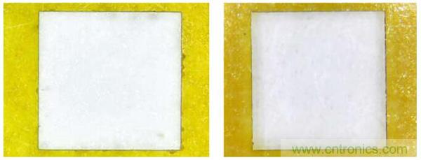 圖2.紫外激光 PI 膜開窗(左圖為 0.5mil 厚,右圖為 1mil厚)