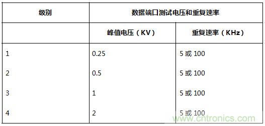 IEC 61000-4-4規(guī)定了不同環(huán)境狀況下的電壓測試級別,分為4級。同時規(guī)定了不同測試級別對應(yīng)的測試電壓和脈沖重復速率。