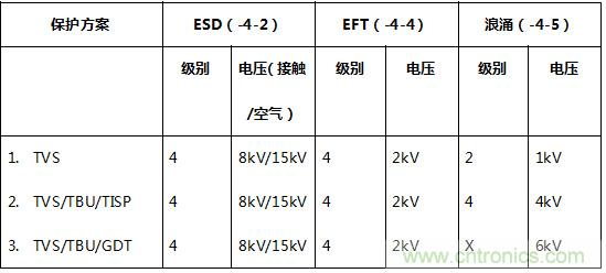 按照以上的規(guī)范要求和設(shè)計原則,下面我們提供三種不同級別的EMC防護解決方案,這些方案都已經(jīng)經(jīng)過了第三方獨立EMC兼容性測試的認證。方案中用到的元器件包括: