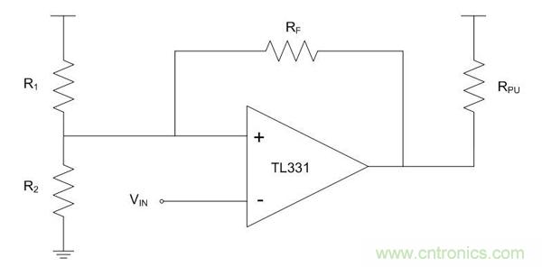 下面的例子所示為安森美半導(dǎo)體TL331配置為一個(gè)反相施密特觸發(fā)器。L331是無(wú)內(nèi)部滯回的單通道、低功耗、集電極開(kāi)路的比較器。由R1和R2電阻創(chuàng)建的電阻分壓器在非反相引腳上設(shè)置參考電壓,在比較器輸出開(kāi)關(guān)處設(shè)置閾值電壓。由于這是一個(gè)集電極開(kāi)路的比較器,所以連接一個(gè)上拉電阻到輸出。反饋電阻通過(guò)正反饋增加滯回。通常情況下,使用一個(gè)比較大的反饋電阻值,至少100 KΩ。
