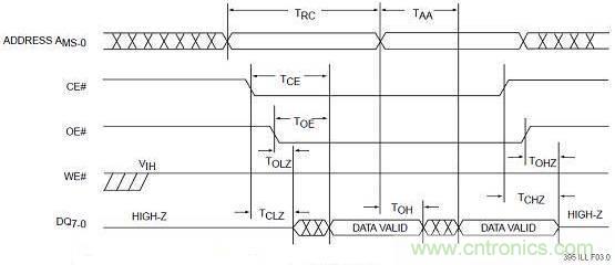 從圖中我們可以看出ADDRESS是表示地址總線的,DQ是表示數(shù)據(jù)總線的,CE是片選信號(hào),且是低電平有效,其寬度要保證在進(jìn)行讀操作時(shí)總是有效的。學(xué)會(huì)看時(shí)序圖對(duì)于做嵌入式系統(tǒng)開發(fā)非常有幫助,因?yàn)槲覀儾豢杀苊獾囊c芯片打交道。在時(shí)序圖中,通常會(huì)標(biāo)識(shí)很多的時(shí)間需求信息。在寫啟動(dòng)代碼時(shí)需要初始化各地址空間的片選地址寄存器和讀寫時(shí)序,時(shí)序的配置依據(jù)就是來自于外設(shè)芯片的時(shí)間需求,這是芯片手冊(cè)很重要的一部分內(nèi)容。當(dāng)一個(gè)地址空間中存在多個(gè)外設(shè)芯片時(shí),我們需要考慮到其中最慢的外設(shè)芯片的時(shí)間需求,否則的話有的芯片就不能正常工作。