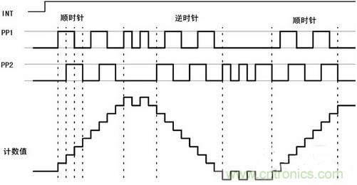 方向盤轉(zhuǎn)角傳感器的輸出為正交編碼脈沖。正交編碼脈沖包含兩個脈沖序列,有變化的頻率和四分之一周期(90°)的固定相位偏移,如圖1所示。通過檢測2路信號的相位關(guān)系可以判斷為順時針方向和逆時針方向,并據(jù)此對信號進(jìn)行加/減計數(shù),從而得到當(dāng)前的計數(shù)累計值,也即方向盤的絕對轉(zhuǎn)角,而轉(zhuǎn)角的變化率即角速度,則可通過信號頻率測出。另外,方向盤轉(zhuǎn)角傳感器有一個零位輸出信號,當(dāng)方向盤在中間位置時,該信號輸出0V,否則輸出5V,通過該信號,可對絕對轉(zhuǎn)角進(jìn)行在線校準(zhǔn)。
