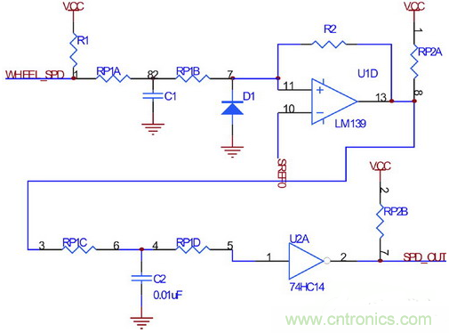 電路采用兩級濾波和整形,以保證輪速信號在極低轉(zhuǎn)速下不會丟失,同時避免因懸架振動引起的信號干擾。圖中由電阻R2引入第一級遲滯比較,而使用74HC14引入第二級遲滯比較。