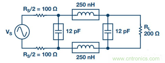 2. 將單端濾波器變?yōu)椴罘譃V波器。源阻抗和負(fù)載阻抗保持不變,所有電容并聯(lián),所有串聯(lián)電感減半并放在另一差分路徑中(參見圖17)。