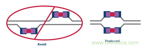 差分對(duì)布線時(shí),應(yīng)使用對(duì)稱布線(參見圖24)。若需要測(cè)試點(diǎn), 應(yīng)避免引入走線分支,而且測(cè)試點(diǎn)應(yīng)對(duì)稱放置(參見圖25)。