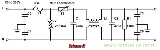 為了解決這一問(wèn)題,最簡(jiǎn)單方法加一個(gè)NTC熱敏電阻(如下圖1中的Z1)來(lái)減小涌浪電流的大小,此時(shí)通電瞬間的浪涌電阻相當(dāng)于電壓除以NTC熱敏電阻與濾波電容的等效串聯(lián)電阻之和
