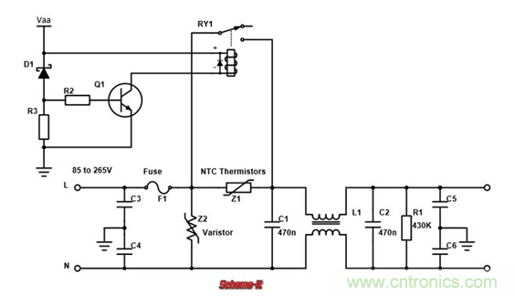 繼電器初始是斷開(kāi)的。當(dāng)Vaa逐漸達(dá)到自身電壓的時(shí)候,齊納二極管D1導(dǎo)通,三極管Q1打開(kāi),繼電器RY1閉合,相當(dāng)于把限流NTC熱敏電阻Z1短路。