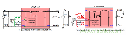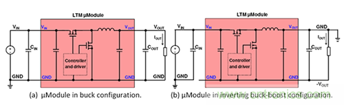 圖1.僅僅幾個連接變化將一個降壓μModule穩(wěn)壓器(a)轉(zhuǎn)換為一個負輸出穩(wěn)壓器(b)