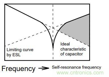MLCC有經(jīng)典的V型阻抗-頻率曲線。隨著頻率升高,寄生電感的影響開(kāi)始凸顯,阻抗先變小再變大,這是MLCC的固有特性。曲線中的最低點(diǎn)就是MLCC的自諧振頻率。