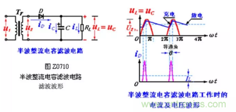 全波或橋式整流電容濾波的原理與半波整波電容濾波基本相同,濾波波形如圖Z0711 所示。