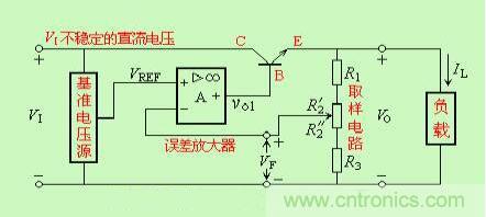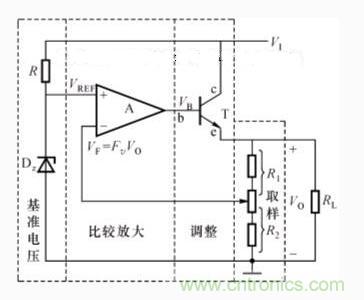 VI是整流濾波后的電壓,T為調(diào)整管,A為比較放大電路,VREF為基準電壓,它由穩(wěn)壓管Dz與限流電阻R構(gòu)成。R1與R2組成反饋網(wǎng)絡(luò),是用來反映輸出電壓變化的取樣環(huán)節(jié)。
