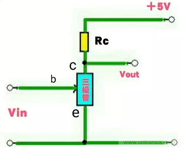 這里假定圖中的三極管是一個NPN型三極管,其c-e兩極之間的電阻可以視為一個受輸入信號控制的壓控電阻。Vin為加在三極管be結(jié)(發(fā)射結(jié))的輸入信號電壓,Vout為三極管集電極的輸出電壓。