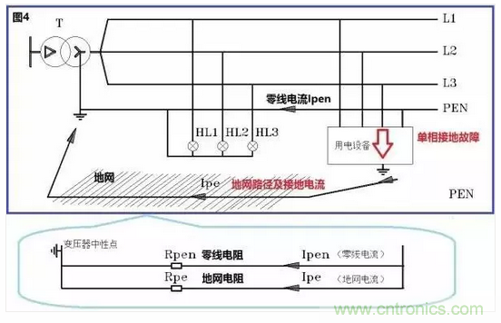 我們看圖4的下圖,我們發(fā)現(xiàn)當(dāng)L3相對用電設(shè)備的外殼短路時(shí),保護(hù)性中性線中有電流流過,地網(wǎng)中也有電流流過。