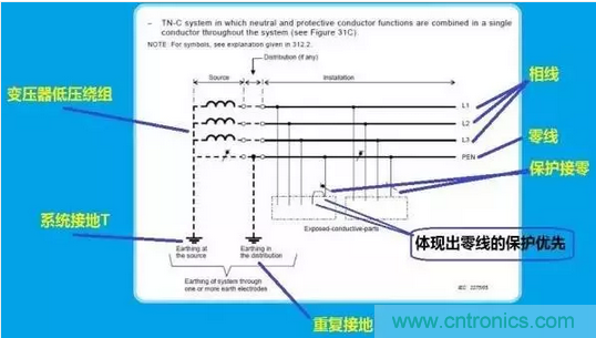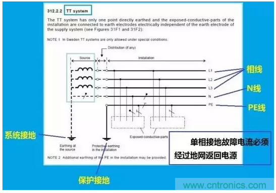 知曉這幾個(gè)概念后,我們來看看IEC給出的有關(guān)TN-C和TT系統(tǒng)的原圖。注意,這兩幅圖是不容置疑的,是有關(guān)接地系統(tǒng)的權(quán)威解釋。