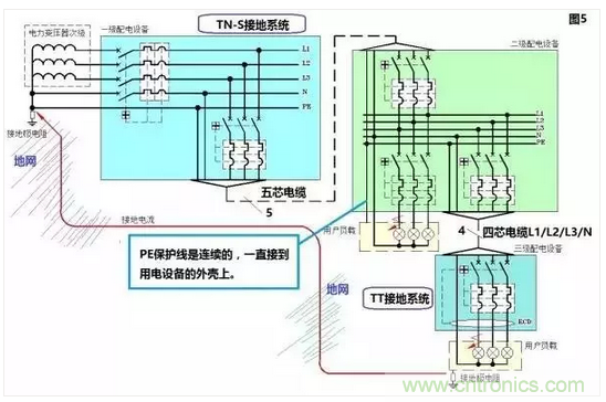注意哦,圖2對應(yīng)的接地系統(tǒng)叫做TN-C,而圖3對應(yīng)的接地系統(tǒng)叫做TN-C-S。